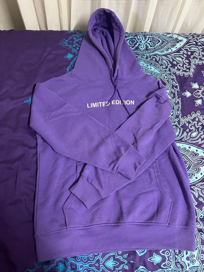 Mor kapüşonlu, XL beden bol kesim ve uzun kollu pamuklu sweatshirt. Önünde "LIMITED EDITION" baskısı bulunur. Günlük kullanıma uygun, rahat ve şık.