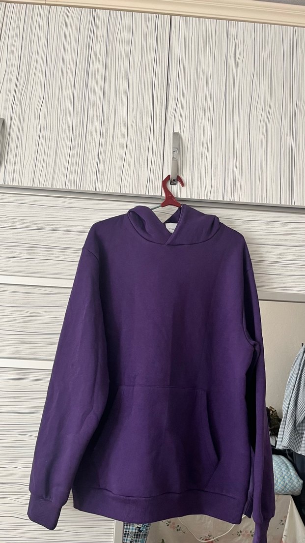 Mor renk, kapüşonlu ve uzun kollu kadın sweatshirtü, midi boy ve bol kesimdir. Yumuşak ve sıcak kumaştan üretilmiş, günlük rahat kullanım için uygundur. Minimalist ve şık bir sokak stili sunar. Etiketlidir