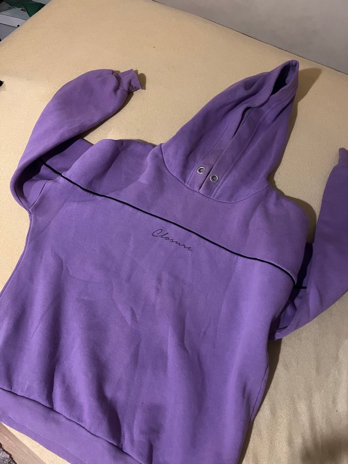 Kadınlar için kapüşonlu, uzun kollu ve bol kesim sweatshirt. Yumuşak ve sıcak kumaştan, pastel mor renkte, desensiz ve günlük kullanım için uygun.