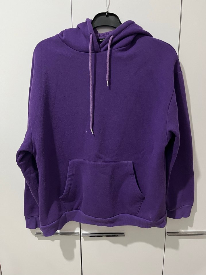 Mor renkte, kapüşonlu ve uzun kollu, rahat kesim kadın sweatshirtü. Yumuşak ve sıcak kumaştan, desen içermeyen sade tasarım.