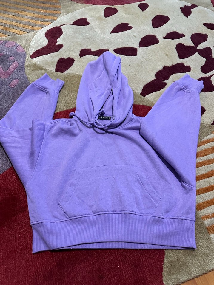 Yumuşak ve sıcak kumaştan, mor kapüşonlu, bol kesim sweatshirt. Uzun kollu ve kanguru cepli, günlük rahat kullanım için uygundur.
