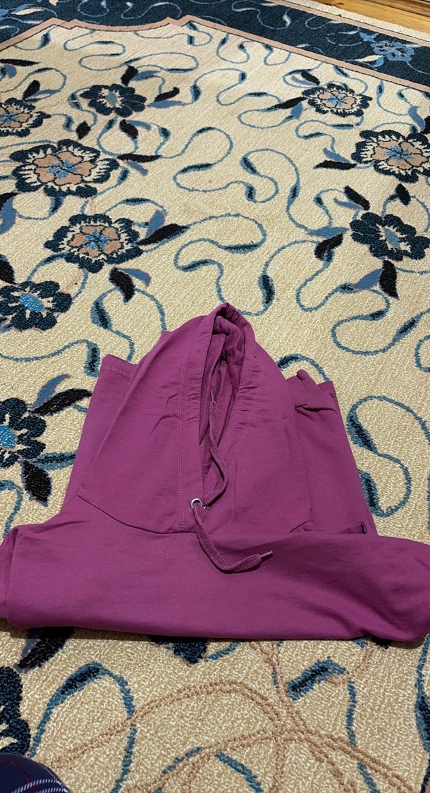 Mor renkte, kapüşonlu ve, sentetik kumaştan üretilmiş bol kesim kadın sweatshirt. Uzun kollu ve normal midi boyda, günlük ve sokak stiline uygun.