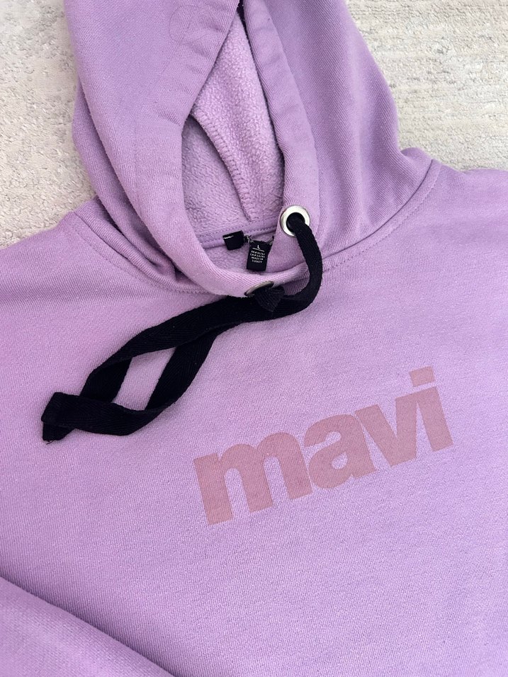 Uzun kollu, kapüşonlu ve bol kesim mor sweatshirt, önünde 'mavi' baskısı vardır. Yumuşak ve sıcak kumaştan, önündeki leke yıkayınca gider