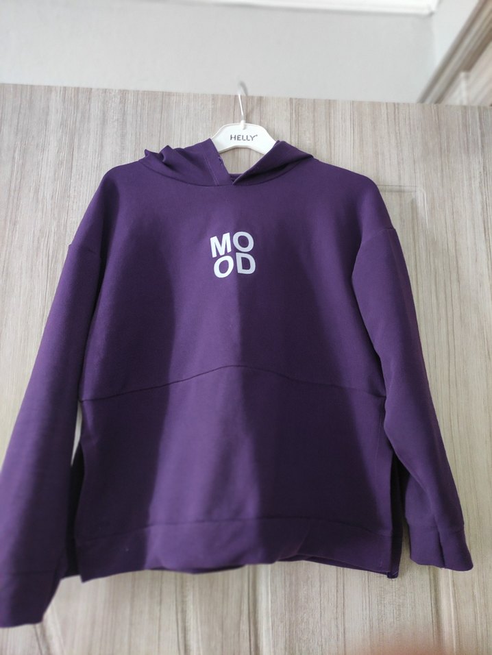 Koyu mor renkte, kapüşonlu kadın sweatshirt. Yumuşak kumaştan, uzun kollu ve bol kesim. Üzerinde "MOOD" baskısı bulunur, rahat ve şık bir tasarım.bir iki kere tek giydim sıfır sayılır kapşon ipi rahatsız etti ondan çıkardım s,m bedne olur