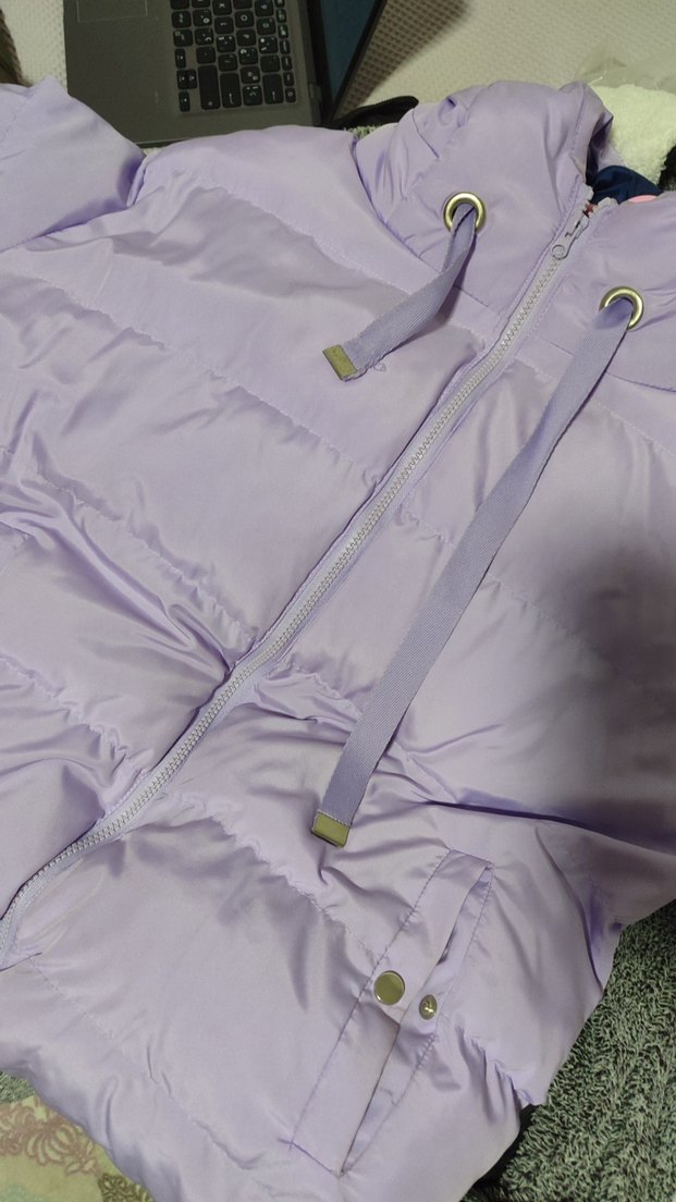 Kapüşonlu, ön fermuarlı mor kalın mont. Ayarlanabilir ip detayları ve yumuşak, sıcak kumaş içerir. yıkandıktan sonra kullanmayı tavsiye ederim.