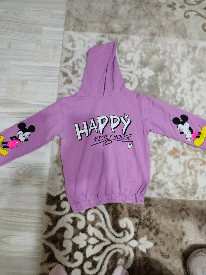 Mor kapüşonlu, uzun kollu kız sweatshirtü. Önünde renkli Mickey Mouse baskısı ve 'HAPPY' yazısı bulunur, yumuşak ve sıcak kumaştandır.