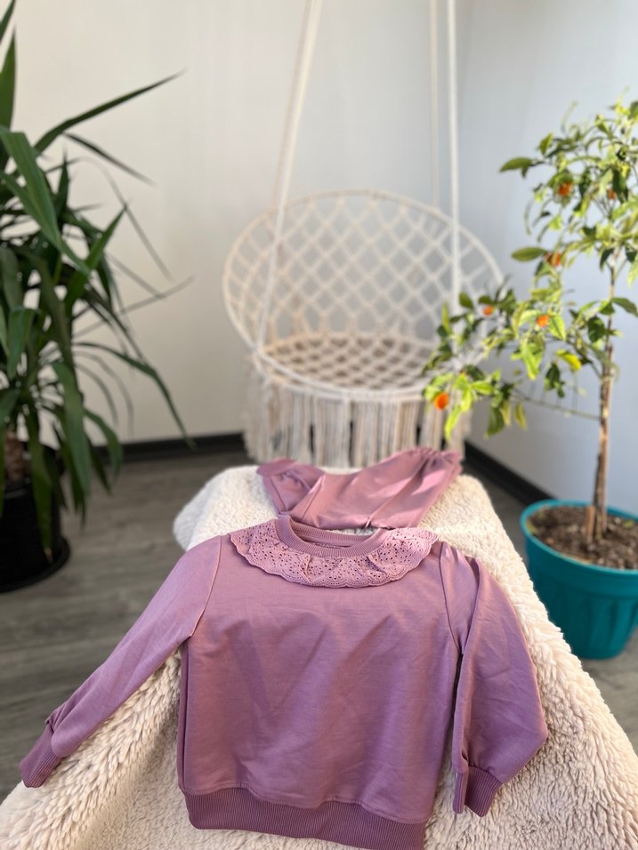 Pastel mor renkte, kapüşonlu ve uzun kollu kız sweatshirtü. takım Rahat kesimi ve fırfır detaylarıyla yumuşak ve sıcak kumaştan üretilmiştir.