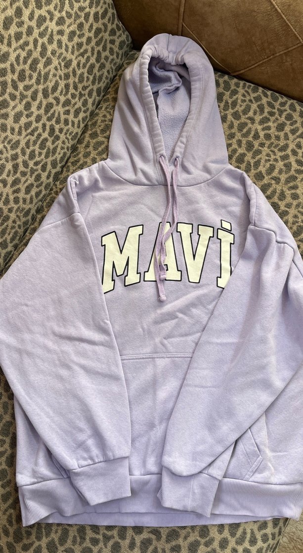 Pastel mor renk, bol kesim uzun kollu kapüşonlu sweatshirt. Önünde fermuarlı ve büyük "MAVI" baskısı bulunur. Yumuşak, sıcak kumaştan üretilmiştir.