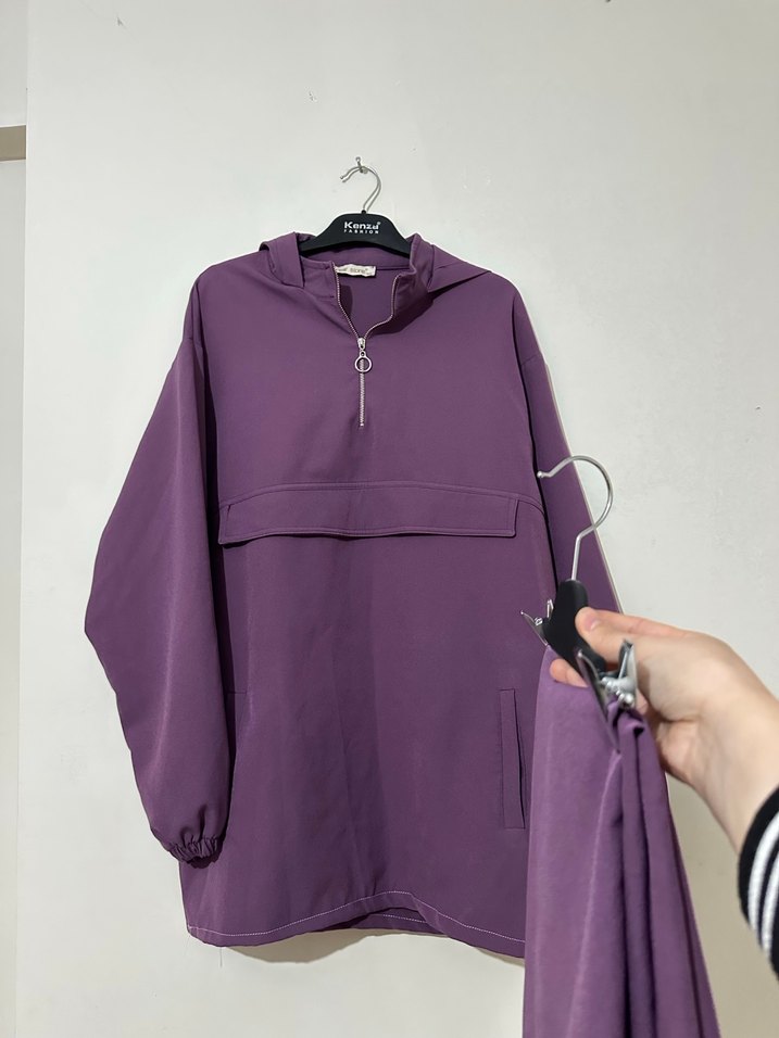 Mor renkte kapüşonlu, fermuarlı, midi uzunlukta ve bol kesim hamile ceketi. Yumuşak ve sıcak kumaştan, uzun kollu, günlük kullanıma uygun. | takım halinde
