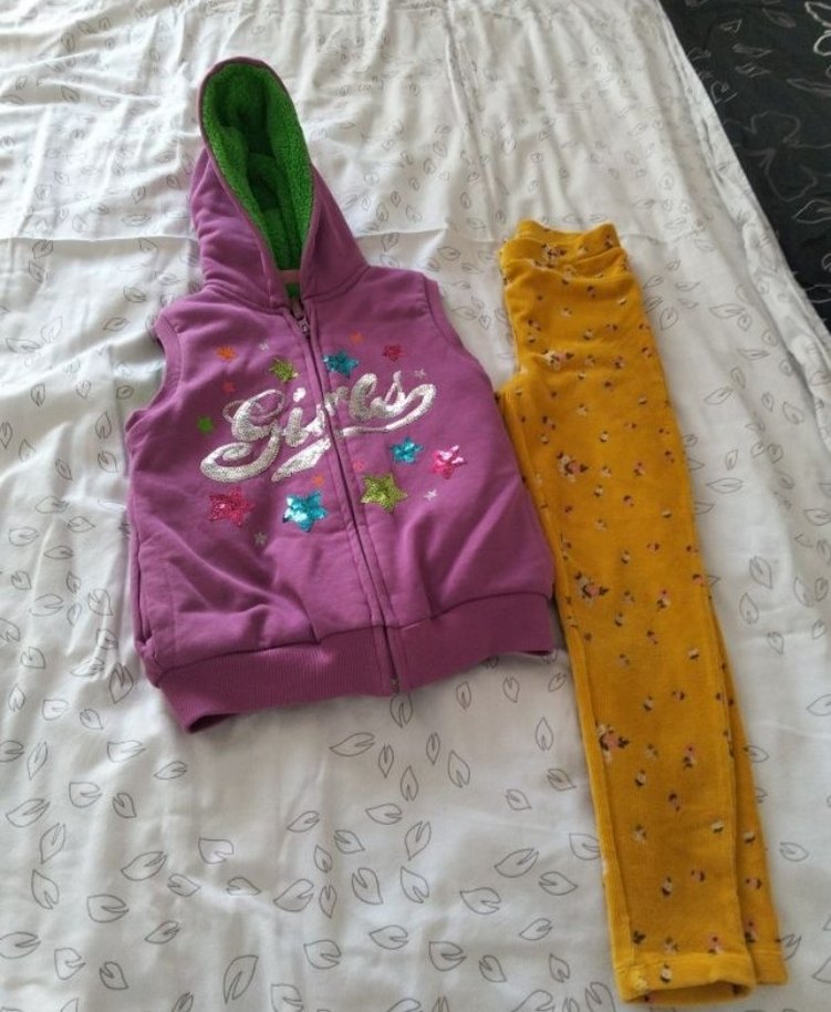 Renkli nakışlı, fermuarlı mor kapüşonlu süveter ve küçük çiçek desenli hardal sarısı tayt takımı.