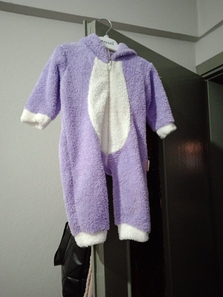 Pastel mor renkte, örgü kumaştan yapılmış, kapüşonlu ve kulak detaylı bebek kış tulumu. Yumuşak ve sıcak tutar.