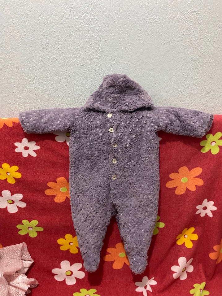 Mor renkli, kapüşonlu ve düğmeli örgü bebek tulumu, yumuşak ve sıcak bir kumaştan üretilmiştir, soğuk havalar için uygundur. ❄️