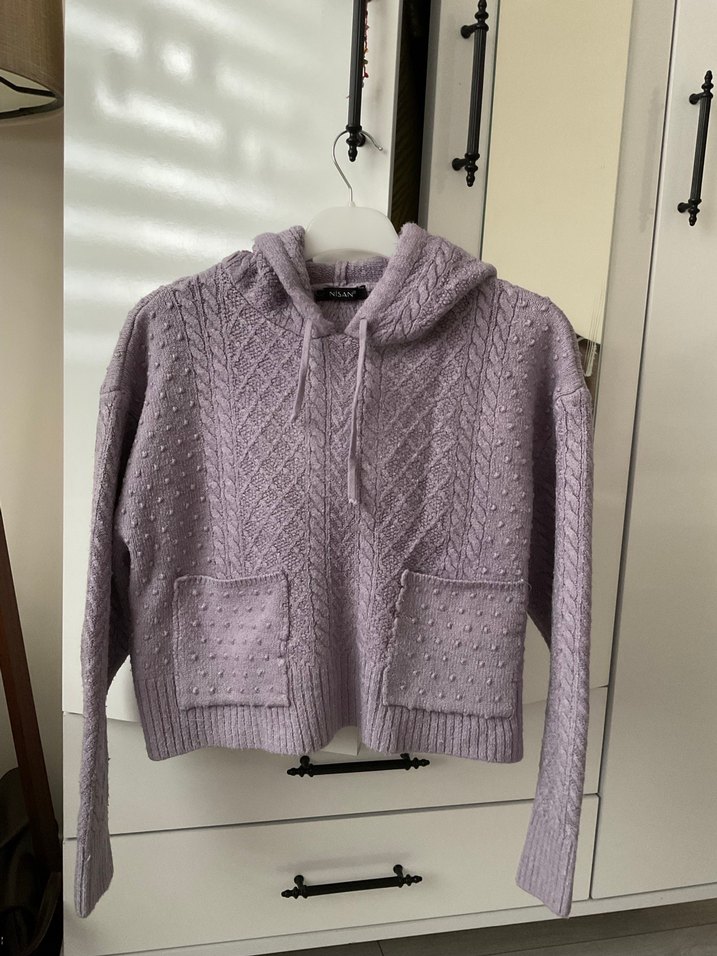 Mor renkli, kapüşonlu uzun kollu örgü kadın kazak, rahat kesim ve cep detaylarıyla günlük sokak stiline uygundur.