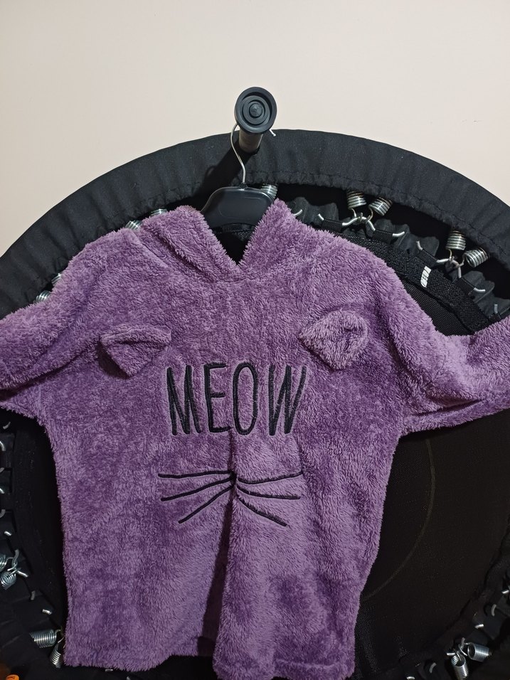 Yumuşak peluş kumaştan, kapüşonlu ve uzun kollu, yumuşak Pijama takımi. Renkli tüylü detaylar ve önünde "MEOW" baskısı bulunur. Alt üst takım şeklindedir.Bedeni XL fakat kalıbı küçük