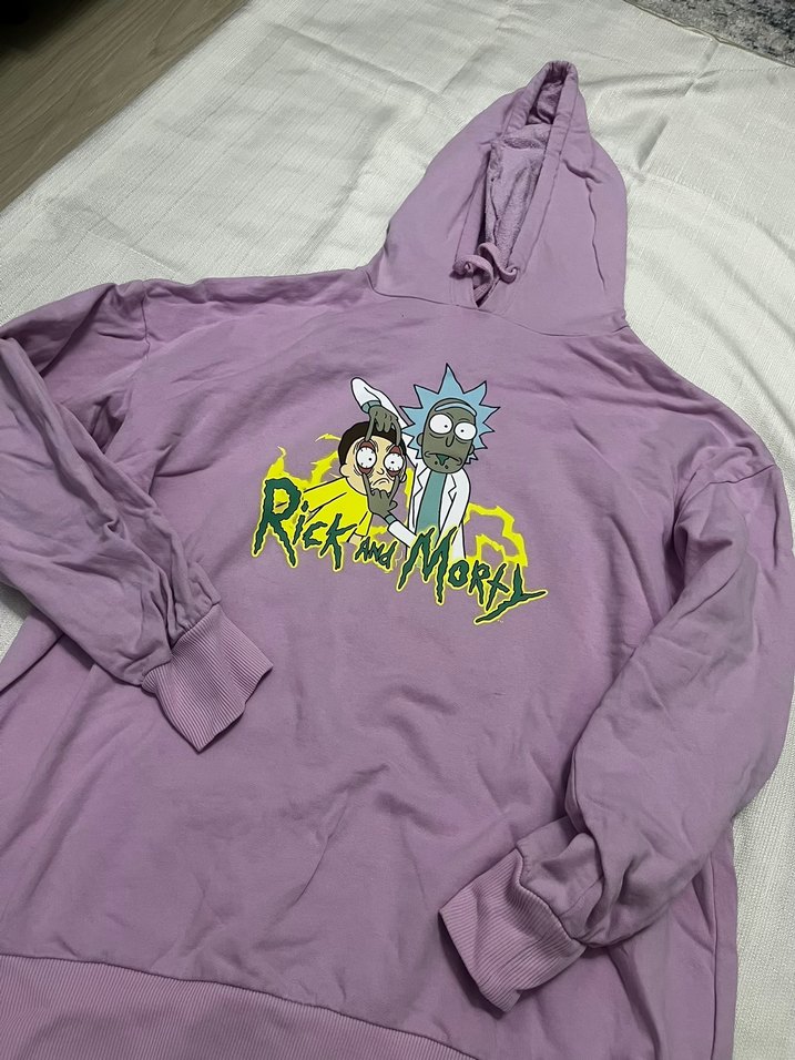 Mor renkte, Rick and Morty baskılı, uzun kollu, fermuarlı ve bol kesim yumuşak kumaştan kapüşonlu sweatshirt. Rahat günlük kullanım için uygun.