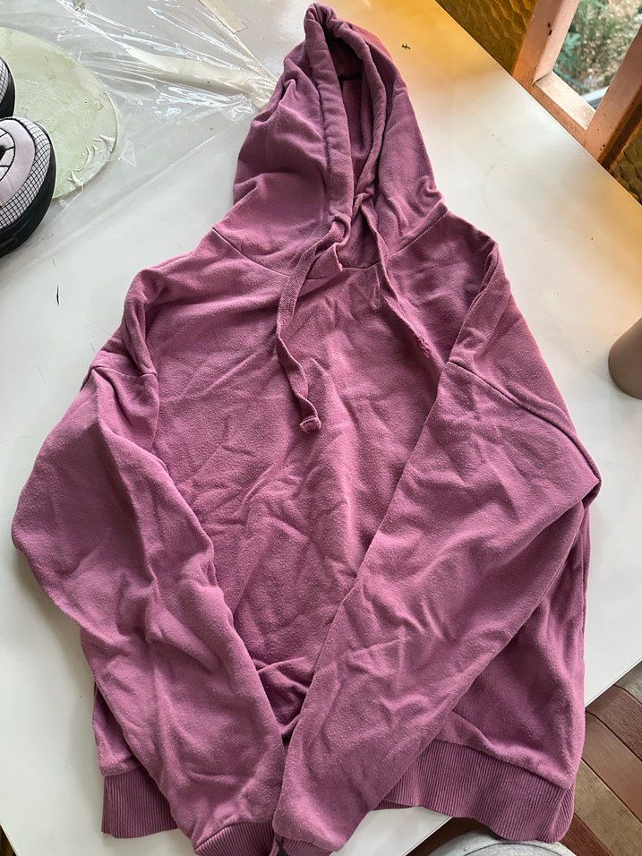 Mor renkte, kapüşonlu ve uzun kollu, salaş kesim kadın sweatshirt. Yumuşak keten kumaştan, midi boyda ve günlük kullanıma uygun.