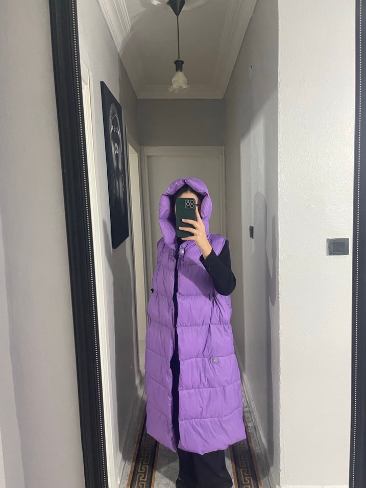 Mor renkte, kapüşonlu ve fermuarlı, yüksek yakalı, uzun kesim kadın yelek. Yumuşak ve sıcak kumaştan, rahat ve şık görünüm sağlar. İçindeki elyafda topaklanma var biraz düzeltilebilir bunun dışında başka sorunu yok