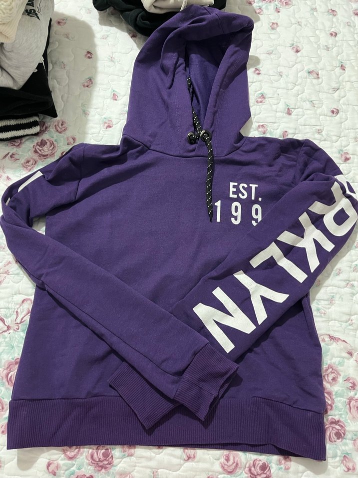 Mor kapüşonlu, uzun kollu ve bol kesim sweatshirt, "EST. 199" ve kolunda baskılı detaylar içerir. Yumuşak sentetik kumaştan üretilmiştir.