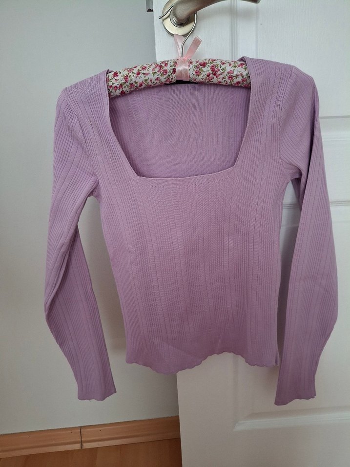 Mor pastel tonlarında, kare yaka ve uzun kollu, vücuda oturan kadın triko kazak. Düz ve rahat dokusu günlük kullanıma uygundur.