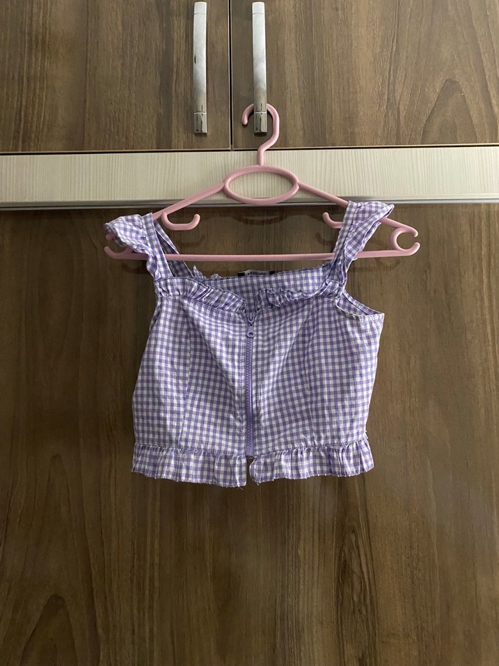 Mor pastel kareli, askılı ve düğmeli, fitted kesim kız bluzu. Sokak stili ve fırfırlı detaylara sahiptir.