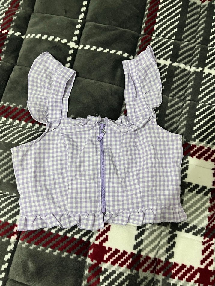 Mor pastel kareli, askısız ve fermuarlı kız bluzu. Sentetik kumaştan, fitted kesim ve sokak modasına uygun tasarım.