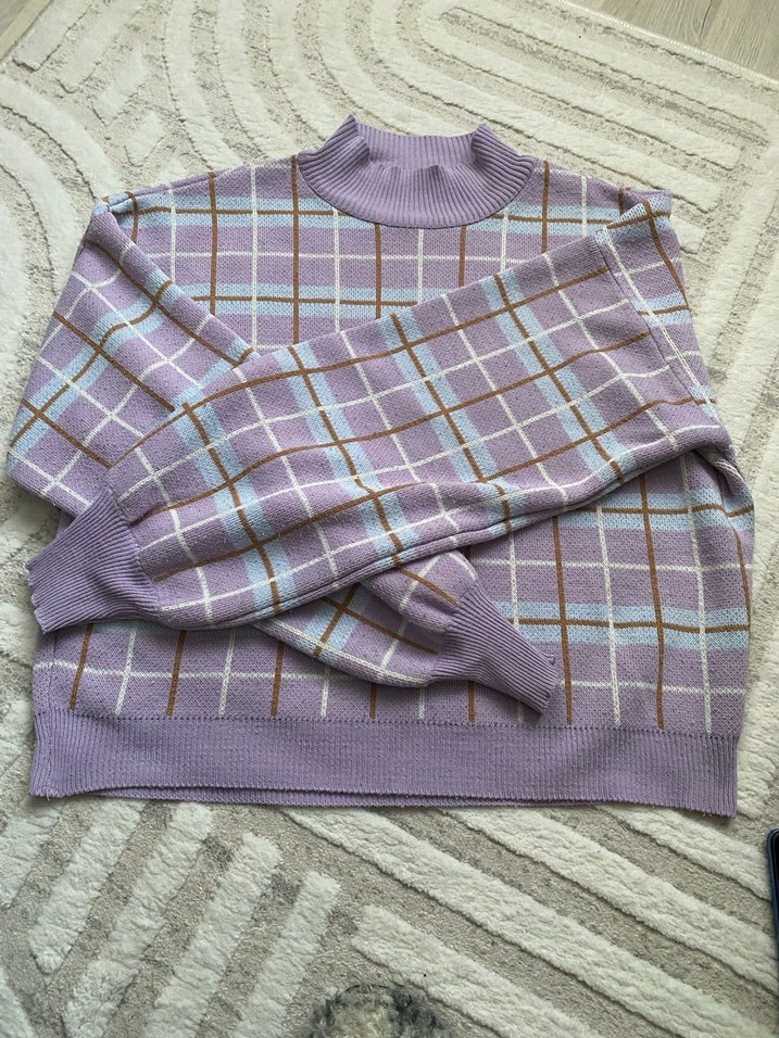 Pastel mor kareli, boğazlı ve uzun kollu, rahat kesim triko kadın kazak. Günlük ve sokak stiline uygun.