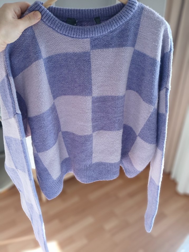 Mor renkli, kareli desenli örgü kadın kazak. Yuvarlak yaka, uzun kollu ve bol kesimdir. Günlük rahat sokak stili için uygundur.