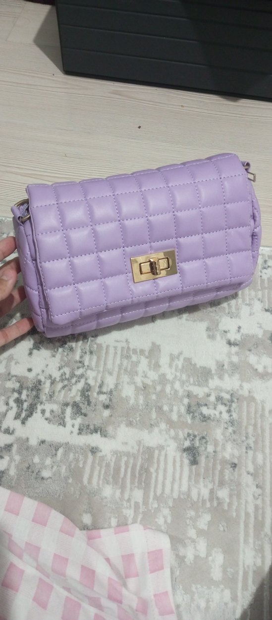 Pastel mor renkte, kareli desenli, tokalı kapaklı ve yumuşak sentetik kumaştan yapılmış modern klasik kadın çantası.