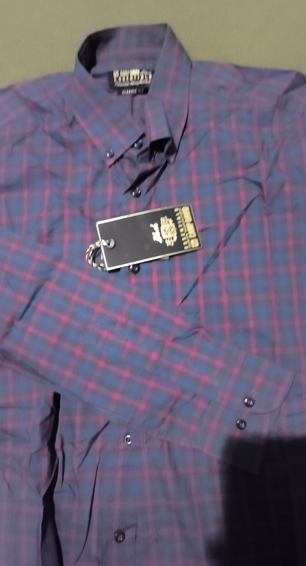 Mor kareli, düğmeli, uzun kollu erkek gömlek, normal boyda, çentikli yakalı ve düzenli kesimlidir. Günlük kullanıma uygundur.