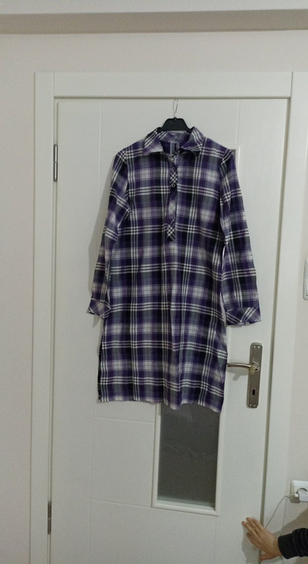 Mor kareli, düğmeli, uzun kollu tunik. Salaş kesim ve yakalı, sentetik kumaştan yapılmıştır. Günlük kullanım için uygundur.