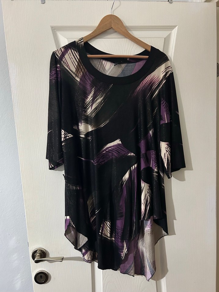 Uzun, salaş kesim büyük beden, tekne yaka ve kısa kolludur. Mor desenli, ipeksi yumuşak kumaştan yapılmıştır, günlük kullanıma uygundur.