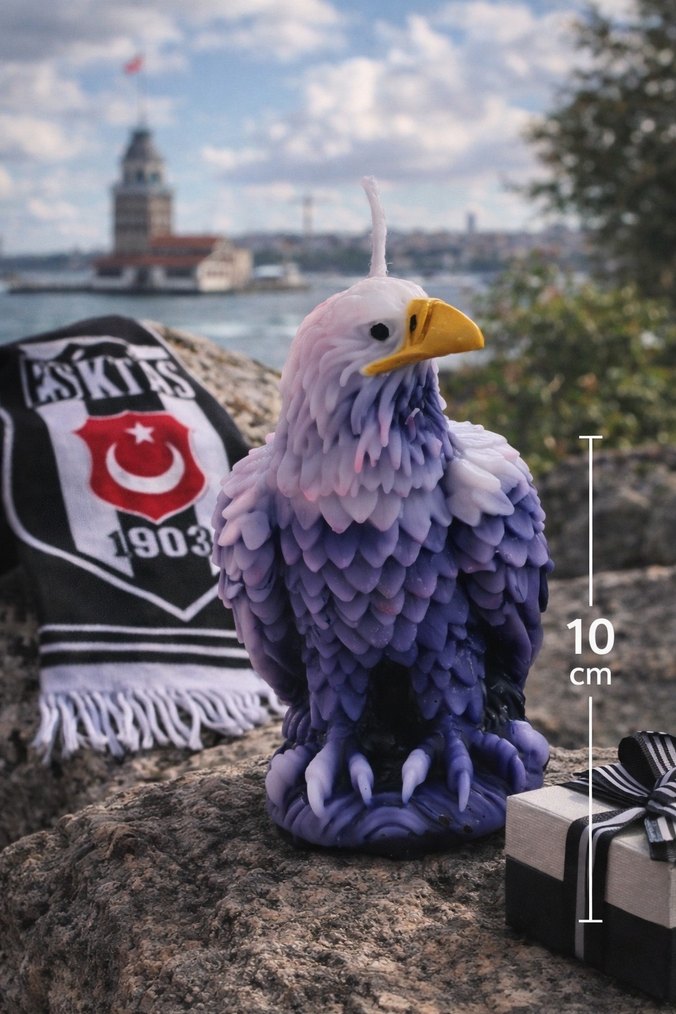 10 cm yüksekliğinde, detaylı tüyleri ve sarı gagası olan renkli mor kartal figürin. Koleksiyonlar için canlı bir dekoratif ürün.