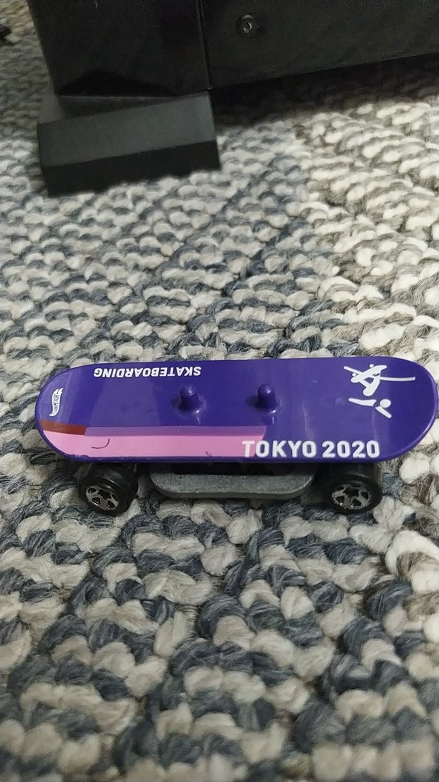 Üzerinde "TOKYO 2020" yazılı koyu mor kaykay model oyuncak araba. Küçük tekerlekleri ve pürüzsüz yüzeyi var.