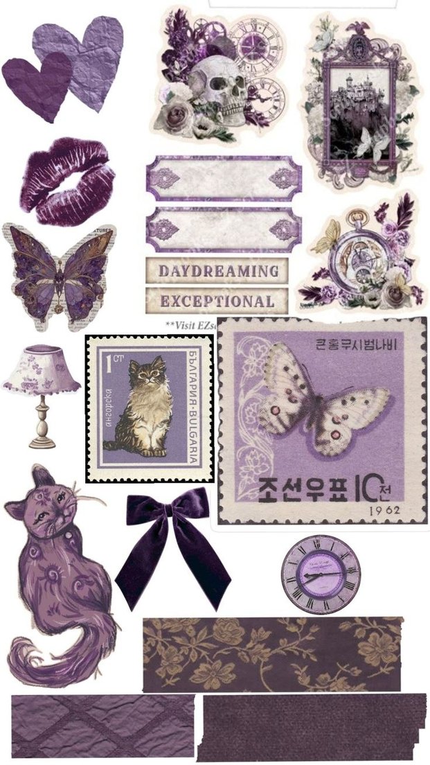 Mor tonlarında kedi temalı çıkartmalar, kelebekler, saatler ve dekoratif etiketlerden oluşan aksesuar seti. "DAYDREAMING" ve "EXCEPTIONAL" yazıları bulunur.