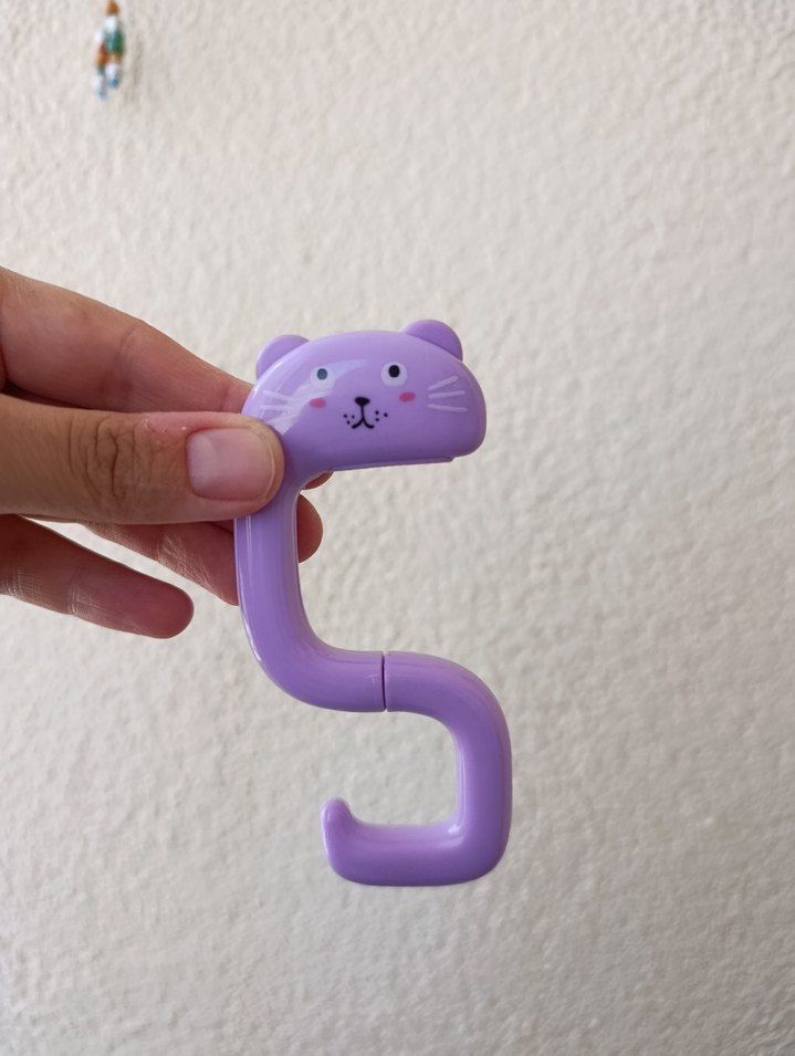 Pastel mor renkte, sevimli kedi figürlü askı kancası. Hafif eşyalar için dayanıklı ve pürüzsüz malzemeden üretilmiştir.