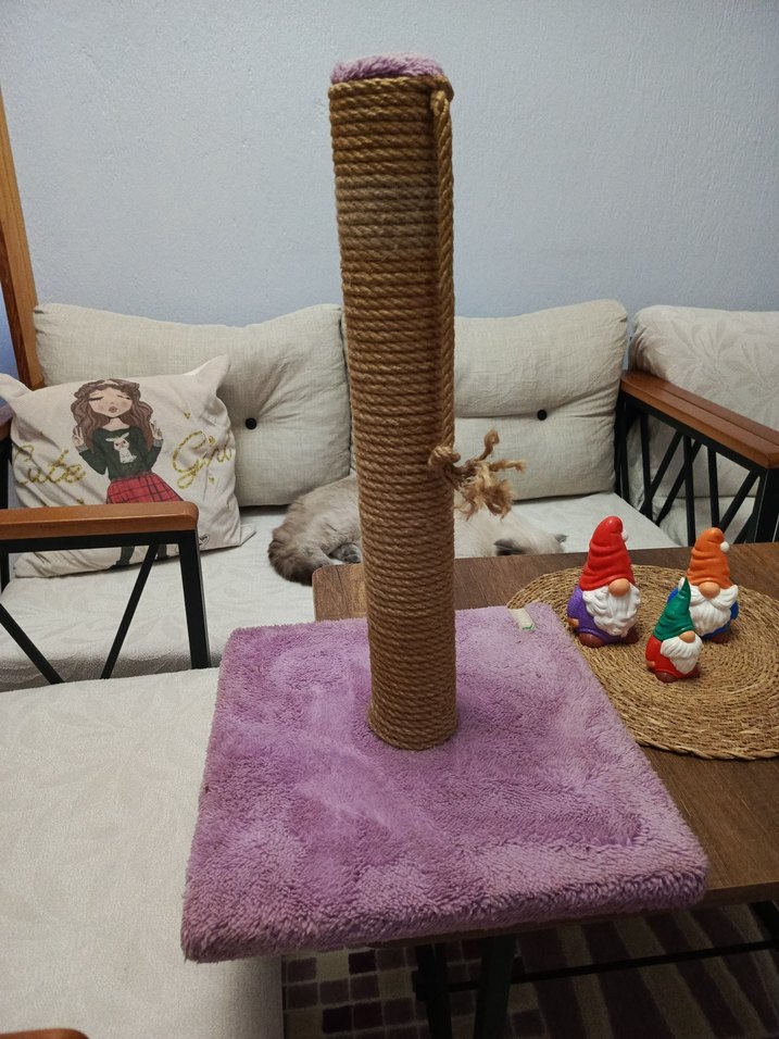 Kedim büyüdü maalesef artık boyu kısa kalıyor. mor peluş, doğal ip kaplı dikey direk ve oyuncaklı kedi tırmalama tahtası.