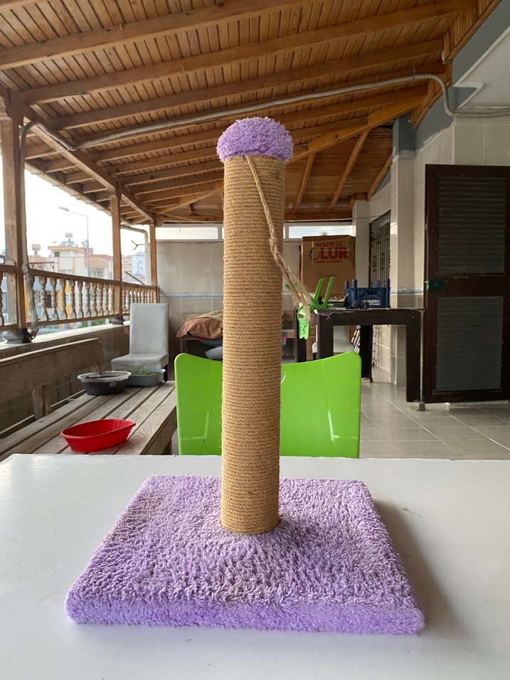 Pastel mor renkte, yumuşak tabanlı ve sisal kaplı dikey direği olan kedi tırmalama tahtası. Oyuncak ip bağlıdır.
