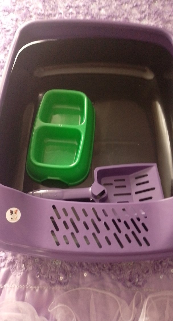 Mor renkte kedi tuvalet kabı, içinde yeşil çiftli mama kabı ve aynı renkte kürek bulunur. Hava akışı için delikli tasarıma sahiptir.