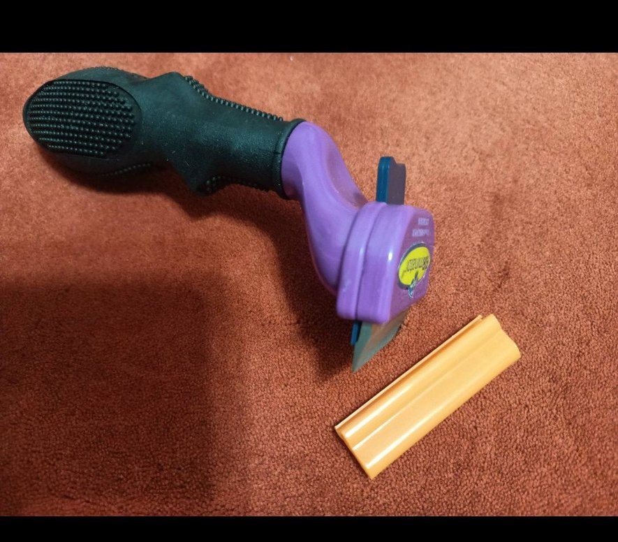 Renkli mor kedi tüyü temizleyici, siyah rahat sap ve kolay tüy temizliği için keskin bıçak içerir. Turuncu koruyucu kapak dahildir. ürün orijinaldir