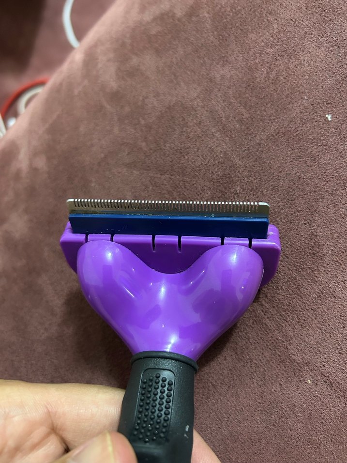 Konforlu siyah sap ve ince metal dişlere sahip koyu mor kedi tüyü toplayıcı tarağıdır.