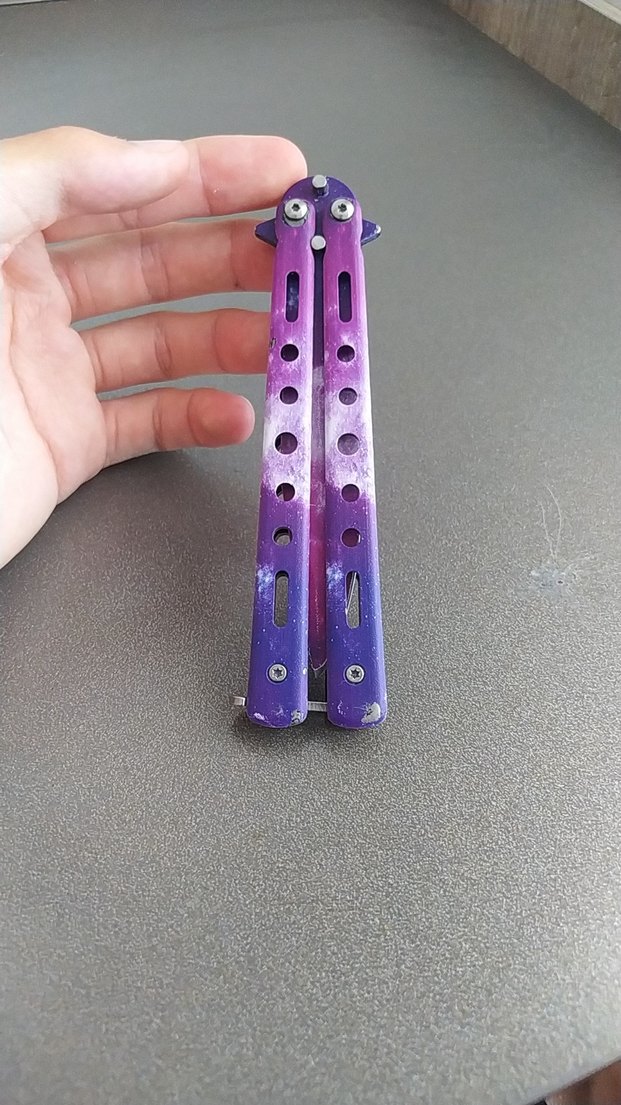 üründe tek sorun kozmetik onun haricinde kaymak gibi hareket ediyor ben ucunu biledim keskin olsun diye ama keskin deyil rahat rahat sallayabilirsiniz sadece ucu siviri. Delikli kulplarıyla koyu mor kelebek bıçak, rahat tutuş sağlar. ️