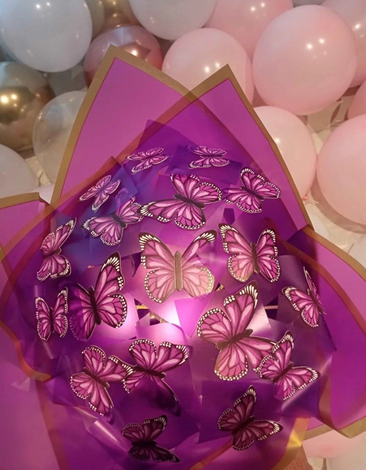 Canlı renklerde, mor kelebek desenli tırnak süsü.