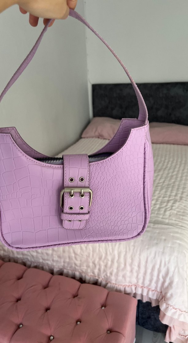 Pastel mor renkte, yılan derisi desenli ve kemerli kapamalı deri kadın çanta, trend sokak modasına uygun.