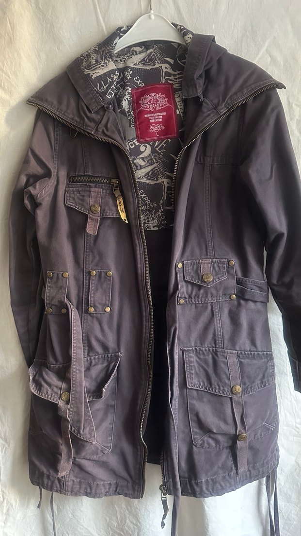 Mor renkte, kemerli ve uzun kollu denim ceket. Gevşek kesimi ve cepleriyle günlük sokak stiline uygun. Boy 80 cm, göğüs çevresi 100 cm, uzunluk 110 cm