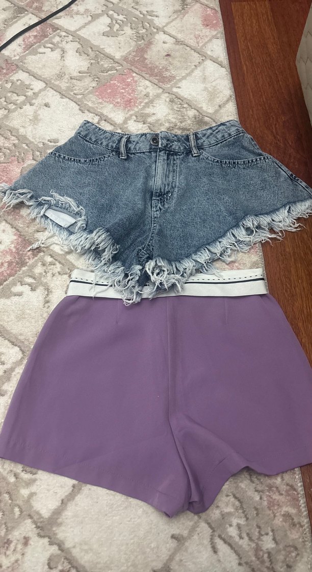 Mor renk kemerli, bol kesim mini şort. Yumuşak denim kumaştan, günlük rahat sokak stiline uygun.