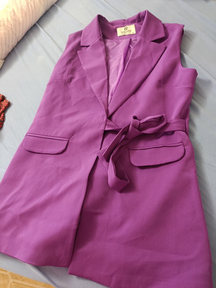 İpek gibi kumaştan, kemerli, mor renkli, kolsuz, normal boyda kadın yeleği. Ofis kullanımı için uygundur ve regular fit kesime sahiptir.