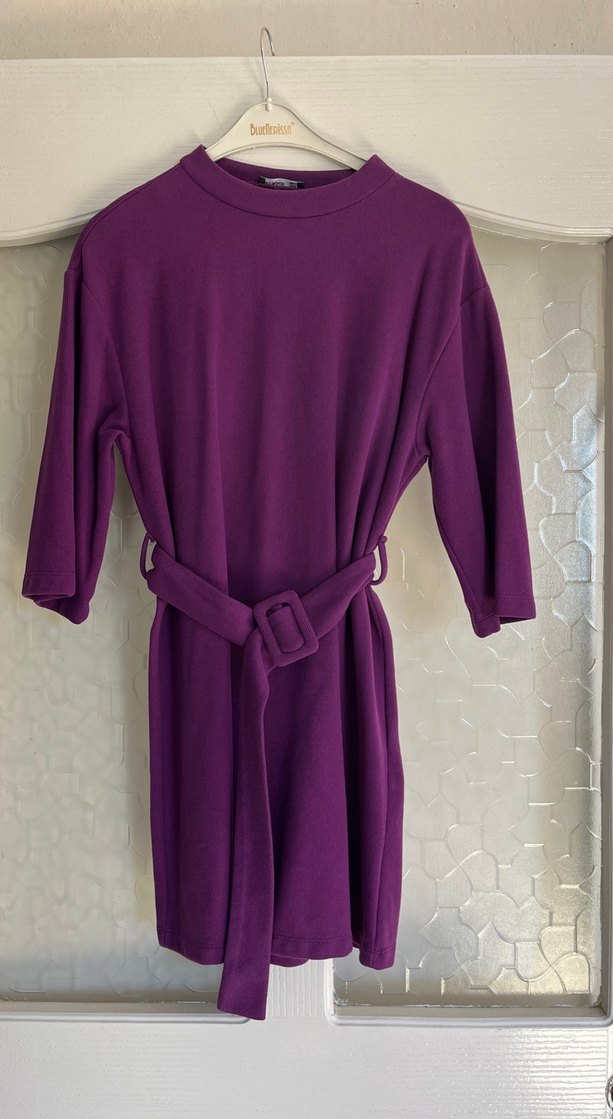 Kemerli ve üç çeyrek kollu, mor renkli, uzun ve vücuda oturan kadın elbisesi. Rahat ve sıcak bir kumaşa sahip.