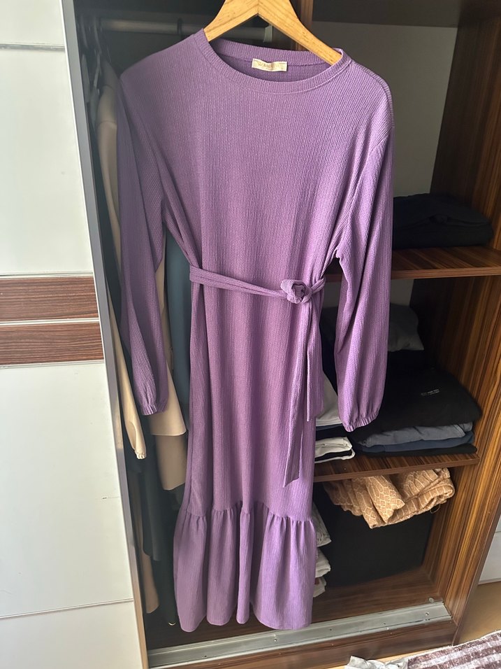 Pastel mor renkte, uzun kollu ve kemerli bu uzun elbise, yuvarlak yakaya sahip. Yumuşak sentetik kumaştan yapılmış, rahat ve normcore tarzda günlük kullanıma uygun.
