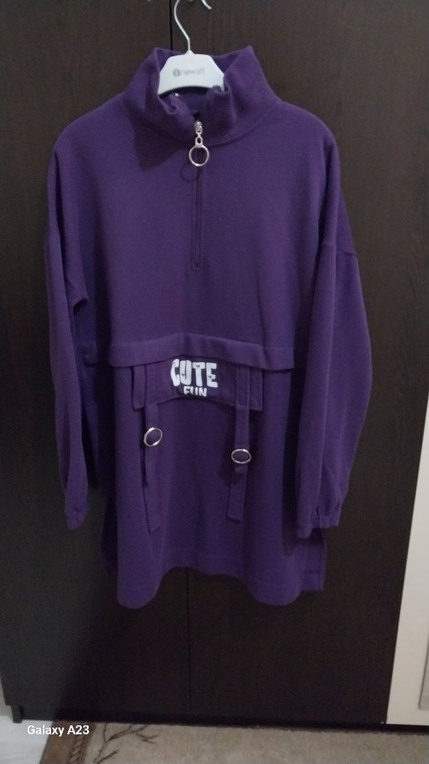 Mor, uzun ve bol kesim sweatshirt. Boğazlı yaka, baskılı desen, kemer ve fermuar detaylı, yumuşak ve sıcak kumaştan yapılmıştır.