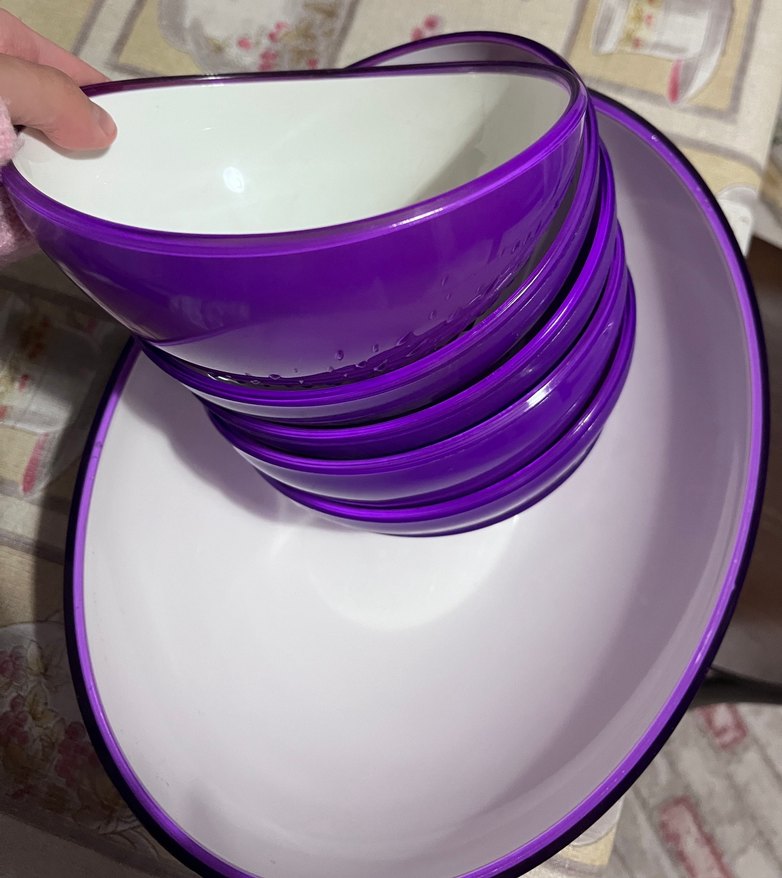 Koyu mor kenarlı beyaz tabaklar, yiyecek servisi için uygun ve kolayca üst üste konulabilir. Parlak ve pürüzsüz yüzeye sahiptir. ️